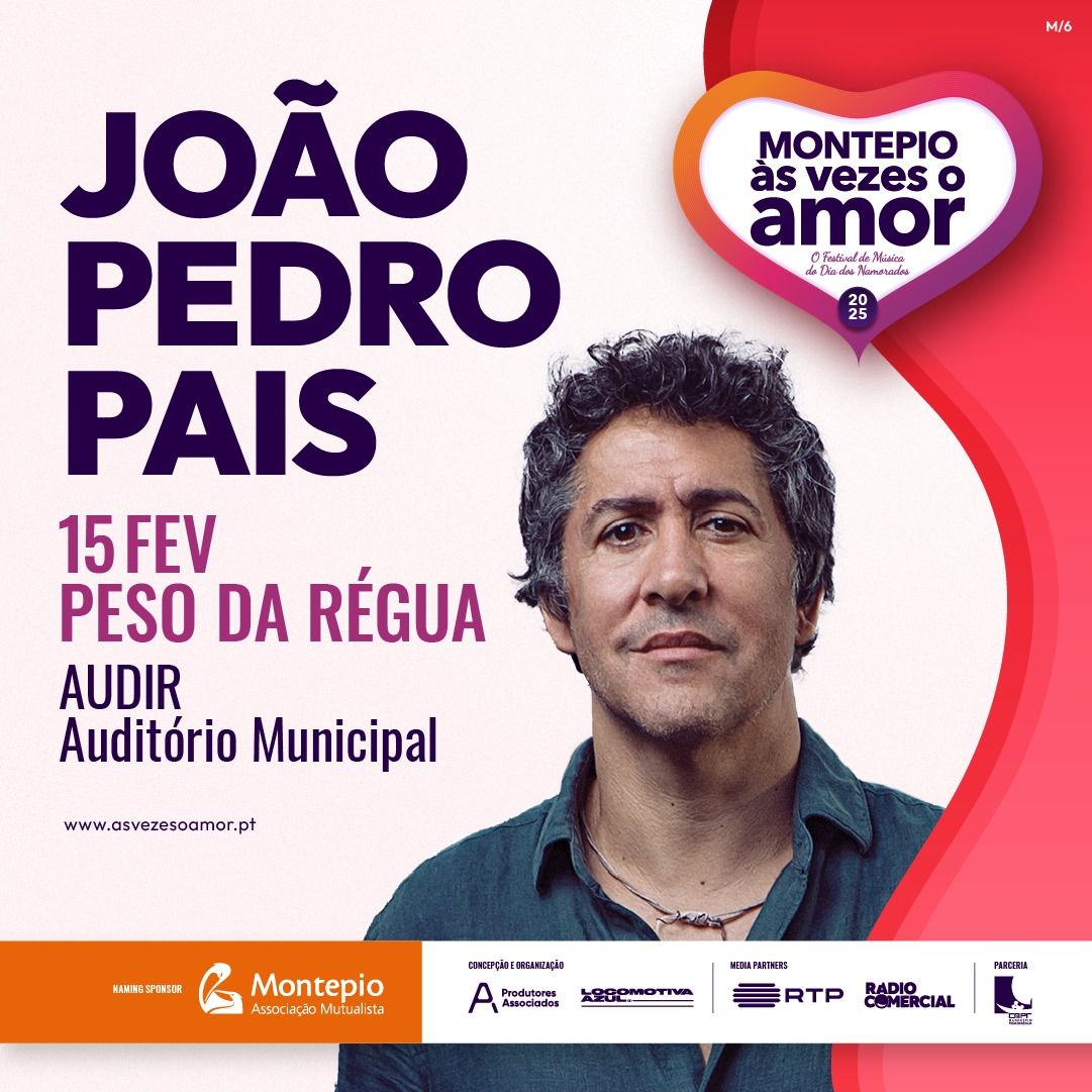 João Pedro Pais marca presença no Festival Montepio Às Vezes o Amor 2025 com um concerto imperdível no Auditório Municipal do Peso da Régua (AUDIR), a 15 de fevereiro! Nesta que será a sua estreia neste palco, o artista promete um espetáculo inesquecível. Com mais de 25 anos de carreira e sucessos que embalam gerações, João Pedro Pais traz emoção, paixão e os seus maiores êxitos. Após uma digressão memorável e Coliseus esgotados, o músico continua em 2025 a encantar palcos por todo o país, celebrando clássicos e revelando novos temas. Prepare-se para um espetáculo único, onde a música e o amor se encontram num momento mágico. Não perca a oportunidade de cantar a plenos pulmões e viver uma noite extraordinária ao som da energia contagiante de um dos artistas mais acarinhados de Portugal!